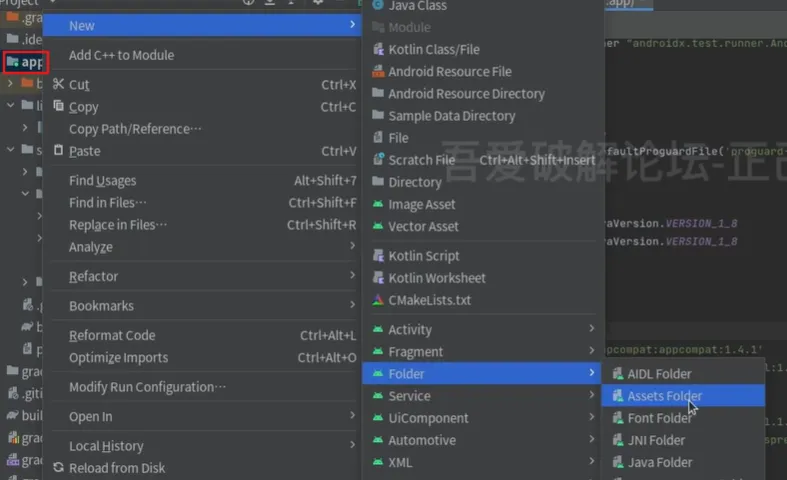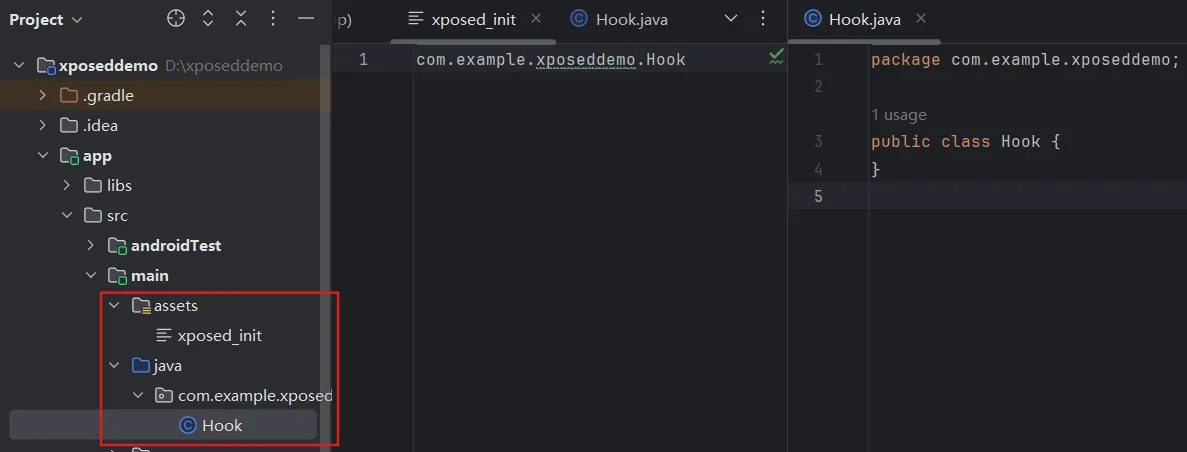 6.新建–>Folder–>Assets Folder,Assets Folder下创建xposed_init文件(不要后缀名):只有一行代码,就是说明入口类