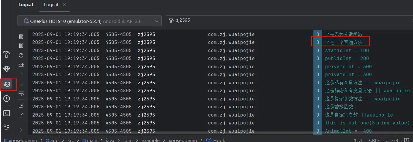 public class Hook implements IXposedHookLoadPackage { @Override public void handleLoadPackage(XC_LoadPackage.LoadPackageParam loadPackageParam) throws Throwable { if(!loadPackageParam.packageName.equals("com.zj.wuaipojie")){ return; } XposedHelpers.findAndHookMethod("com.zj.wuaipojie.Demo", loadPackageParam.classLoader, "a", String.class, new XC_MethodHook() { @Override protected void beforeHookedMethod(MethodHookParam param) throws Throwable { super.beforeHookedMethod(param); XposedBridge.log(param.args[0].toString()); Log.e("zj2595",param.args[0].toString()); String a = "pt"; param.args[0] = a; Log.e("zj2595",param.args[0].toString()); }