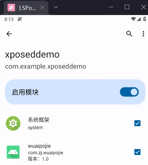 点击运行,之后Lsposed点击加载的xposeddemo,系统模块以及wuaipojie权限开下写入