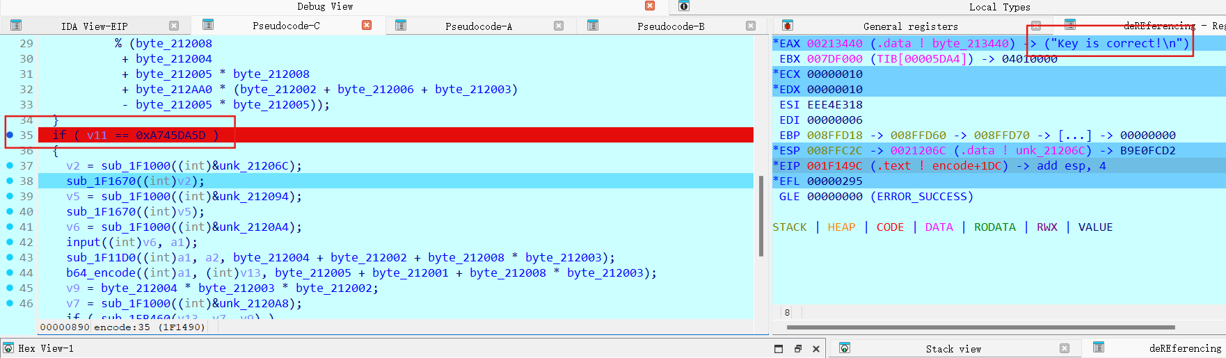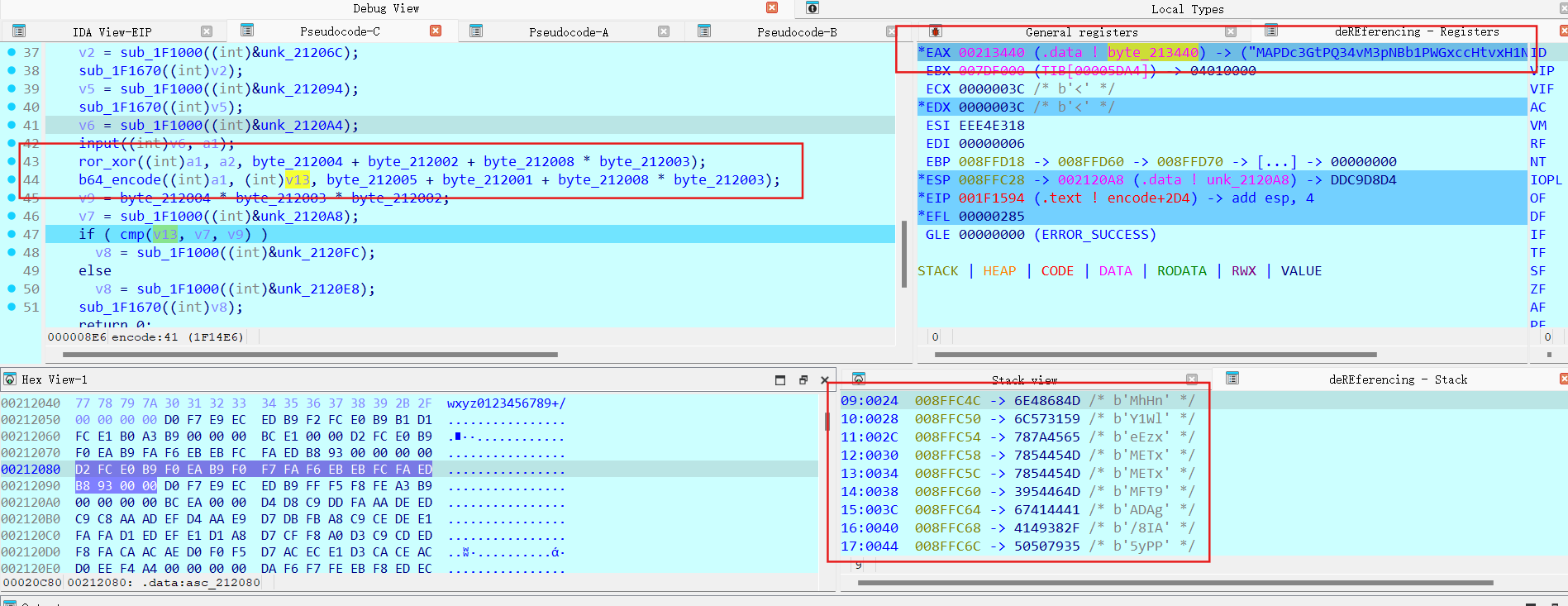 1 2 3 4 5 6 7 8 9 10 11 12 13 14 15 import base64 enc='MAPDc3GtPQ34vM3pNBb1PWGxccHtvxH1NVa9JPTtacS57IilN5uxJSW5Iwm=' key=0x98BF3B77 e1=list (enc)for i in range (0 ,len (enc),4 ): e1[i+1 ],e1[i+2 ]=e1[i+2 ],e1[i+1 ] string='' .join(e1) e2=base64.b64decode(string) e2=bytearray (e2)for i in range (44 ): key_tmp=(key>>(8 *(i%4 ))) & 0xFF e2[i]^=((key_tmp>>4 ) | (key_tmp<<4 )) & 0xFF e2[i]^=key_tmp print (chr (e2[i]),end='' )