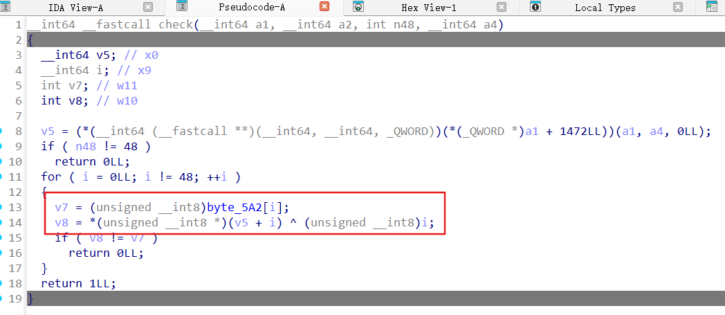 1 2 3 4 5 6 7 8 9 10 11 12 13 14 15 16 17 18 19 20 21 22 23 24 25 26 27 28 from z3 import *def rol (x,n ): return (x<<n) | LShR(x,32 -n) solver=Solver() key=BitVec('key' ,32 ) v11=BitVec(0x81428113 ,32 ) shifts=[(i*13 )%32 for i in range (10 )]for i in range (10 ): v11=(0x1421043 *v11+0x43298815 ) & 0xFFFFFFFF key_tmp=rol(key,shifts[i]) v11^=key_tmp solver.add(v11==0xa745da5d )if solver.check() == sat: model = solver.model() key_value=model[key].as_long & 0xffffffff print (f'key_hex: {key_value:08x} ' )else : print ('无解' )