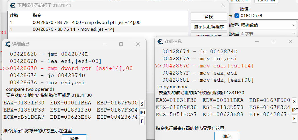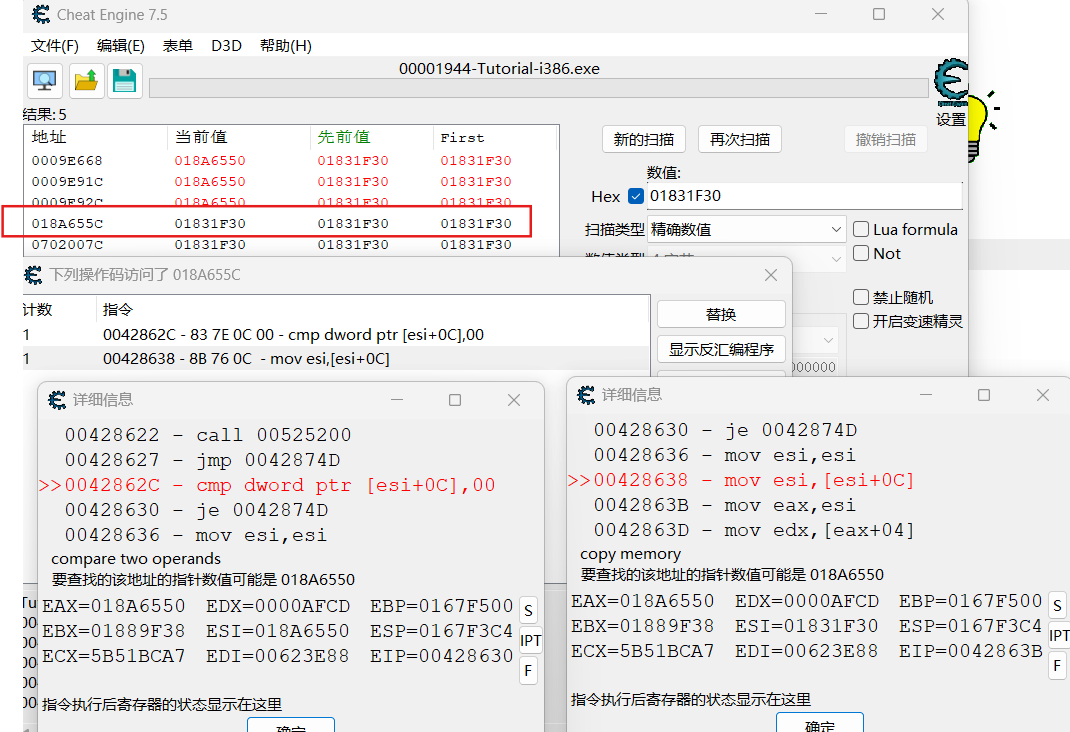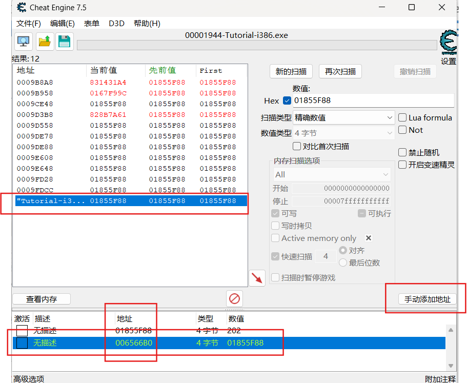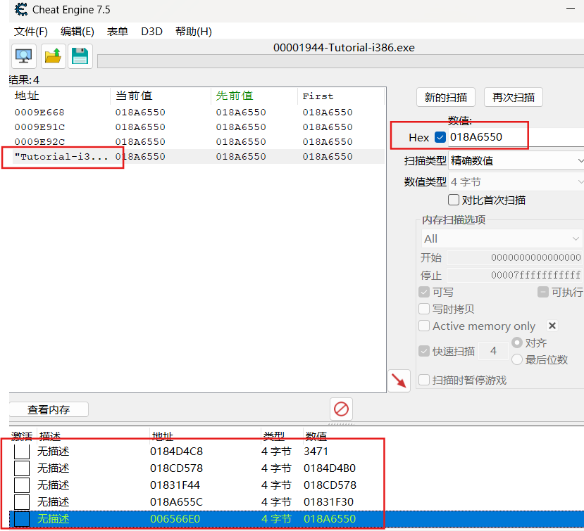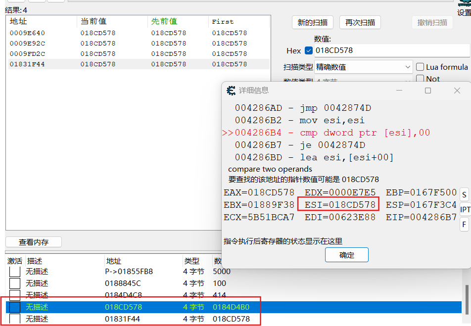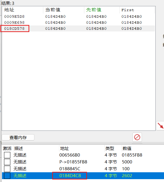 新扫描寻找提示指针数值,根据找到的数值确定指针地址