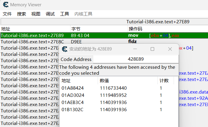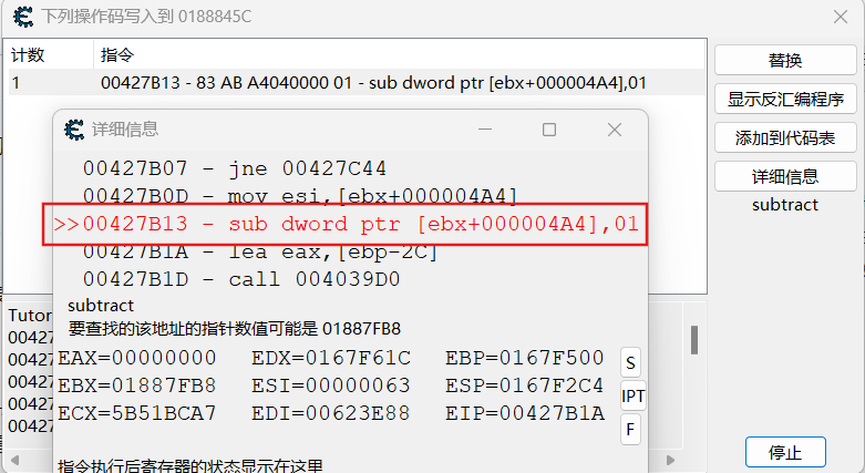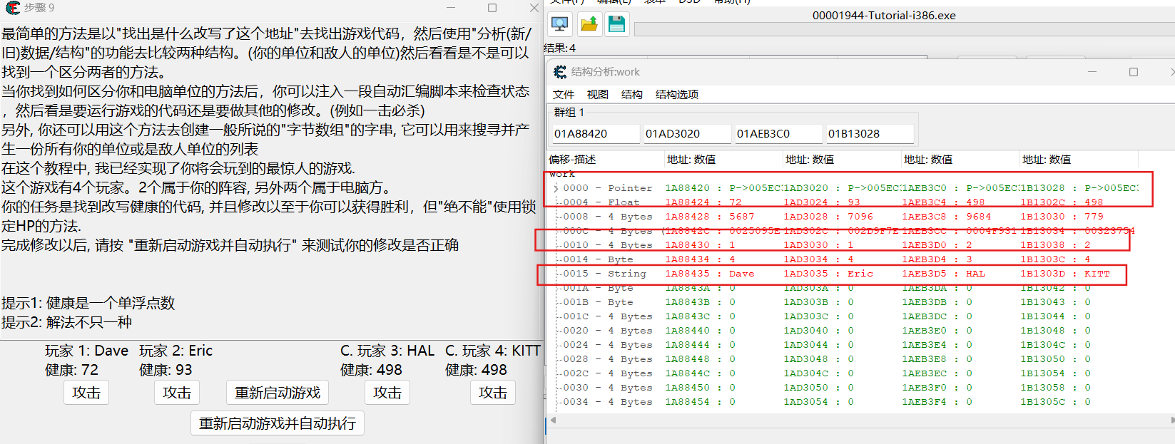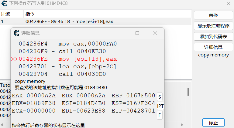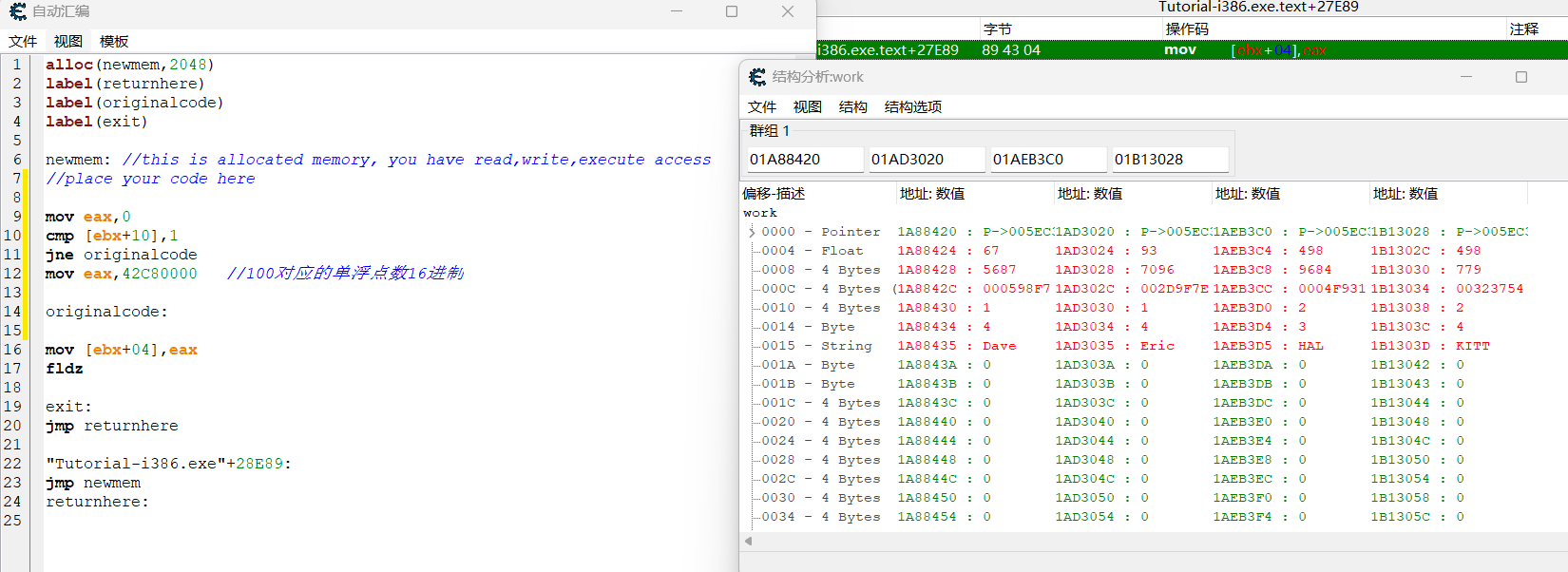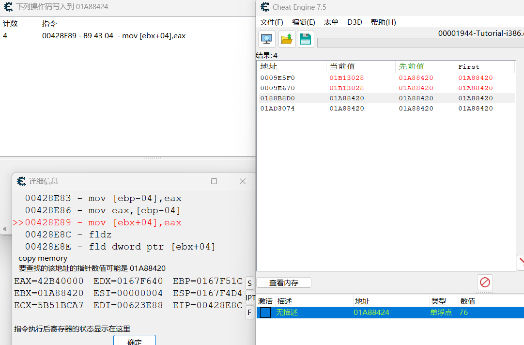 此处四名玩家调用的为同一函数,所以回到先前的 mov [ ebx + 04], eax 处,自动汇编注入代码