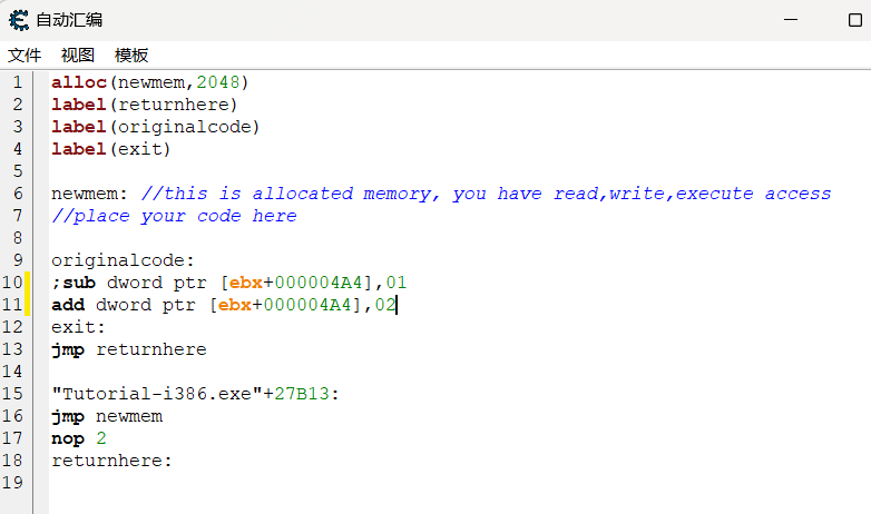 菜单栏->工具->自动汇编->模板->代码注入